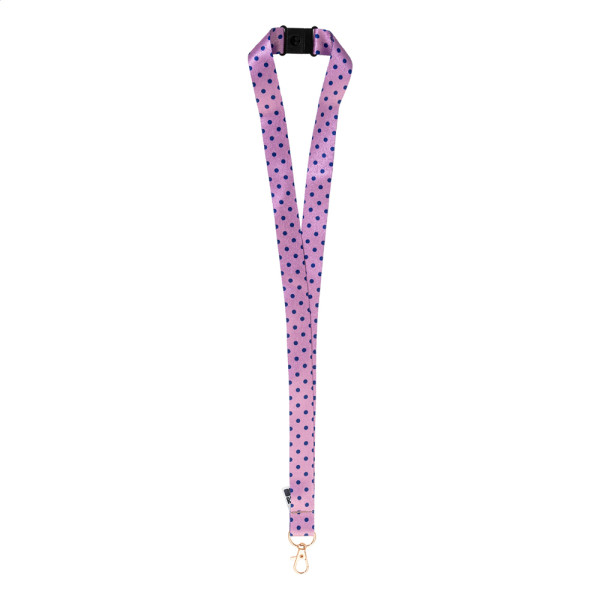 Tour de cou en RPET personnalisable avec mousqueton métallique coloré et boucle de sécurité. Impression en sublimation recto verso. Quantité minimale : 100 pièces.