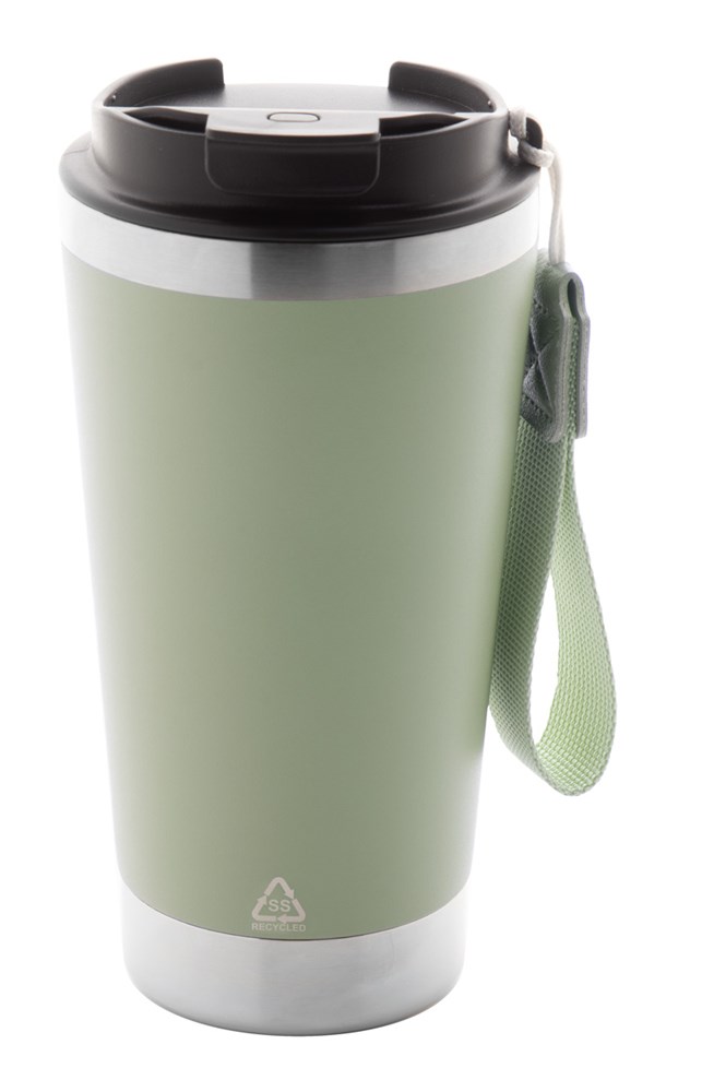 Mug thermos isotherme à double paroi en acier inoxydable recyclé avec couvercle en PP et sangle de couleur assortie. 430 ml.