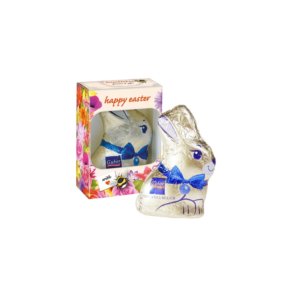Gubor chocolade paashaasje van ca. 12 gram in een all-over full colour bedrukt doosje
