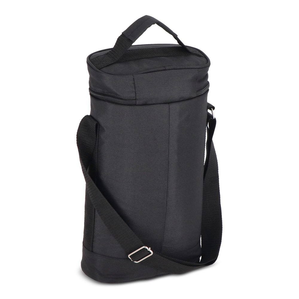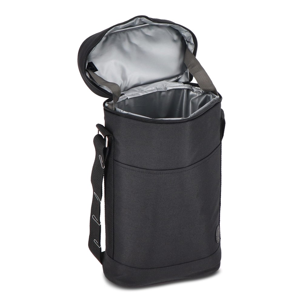 Sac isotherme pratique et sportif en rPET vert. Détails élégants en beige et noir. Un modèle qui peut être utilisé pour deux bouteilles de vin ou des bouteilles PET de 1,5 litre, par exemple. Il est doté d'une poignée et d'une bandoulière réglable.