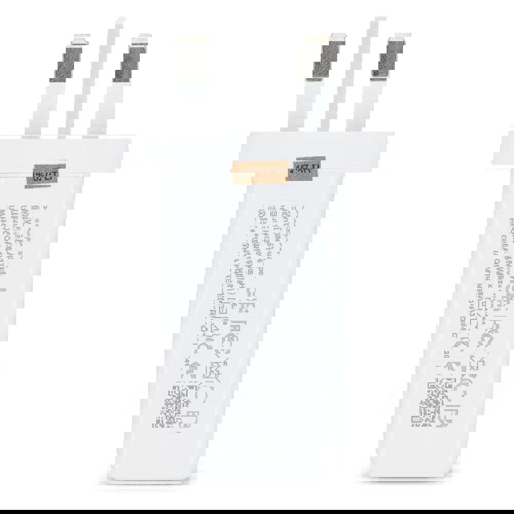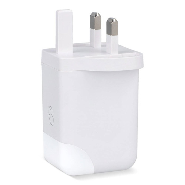 Adaptateur GaN compact 65 W pour ordinateurs, tablettes et smartphones. Ports USB-A (18 W) et Type-C (65 W), même simultanément (9 W chacun). Voyant intelligent s’éteint à charge complète. Plastique recyclé ignifuge. Disponible uniquement au Royaume-Uni.