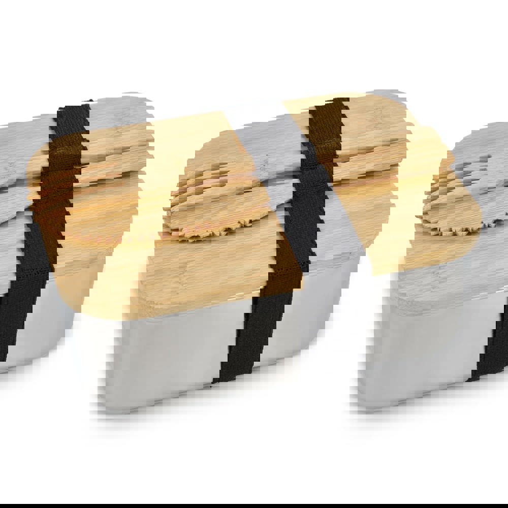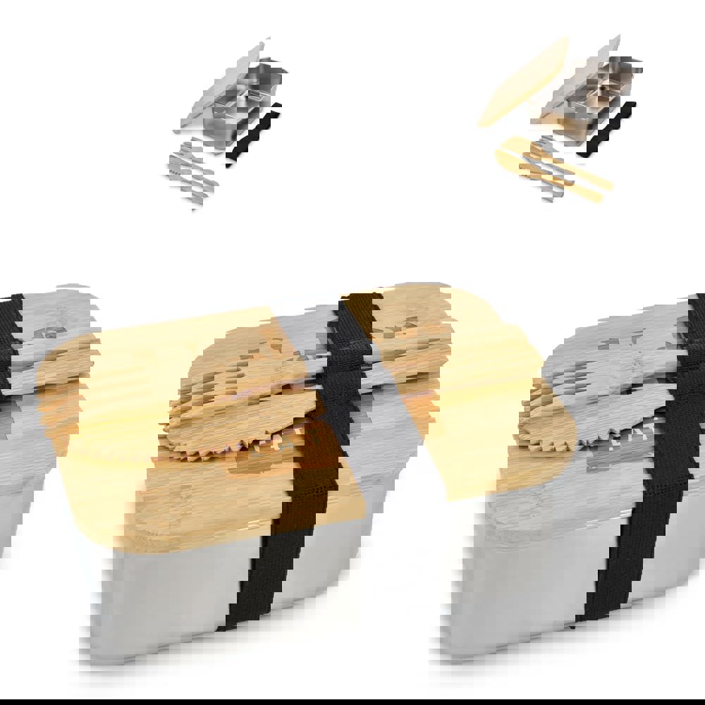 Boîte à lunch en acier inoxydable avec couvercle en bambou. Fermeture par un élastique qui maintient également la fourchette et le couteau en bambou. Emballée individuellement dans une boîte cadeau.