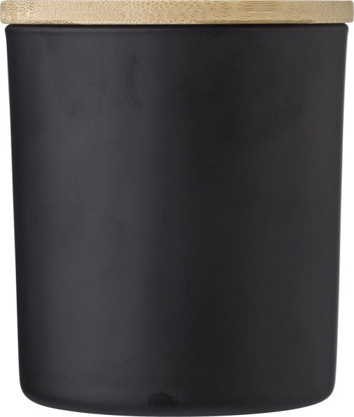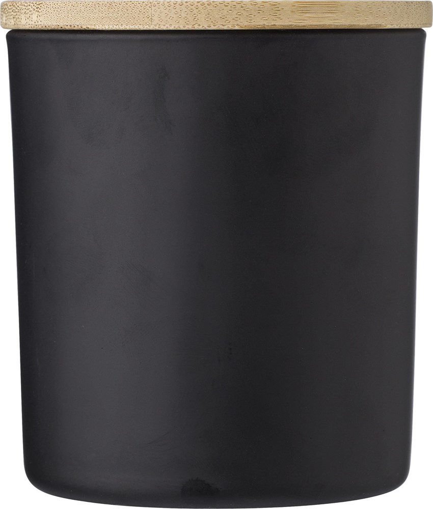 Bougie à base de cire de Carnauba dans un contenant en verre et un couvercle en bambou, d'une durée de 33H, livrée dans un tube cadeau blanc. 4 senteurs sont proposées selon le coloris du contenant : cannelle (bordeaux), vanille (blanc), bois de santal (noir) et jasmin (vert). Gravure laser non conseillée pour le coloris blanc.