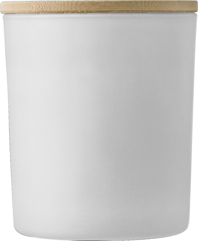 Bougie à base de cire de Carnauba dans un contenant en verre et un couvercle en bambou, d'une durée de 20H, livrée dans un tube cadeau blanc. 4 senteurs sont proposées selon le coloris du contenant : cannelle (bordeaux), vanille (blanc), bois de santal (noir) et jasmin (vert). Gravure laser non conseillée pour le coloris blanc.