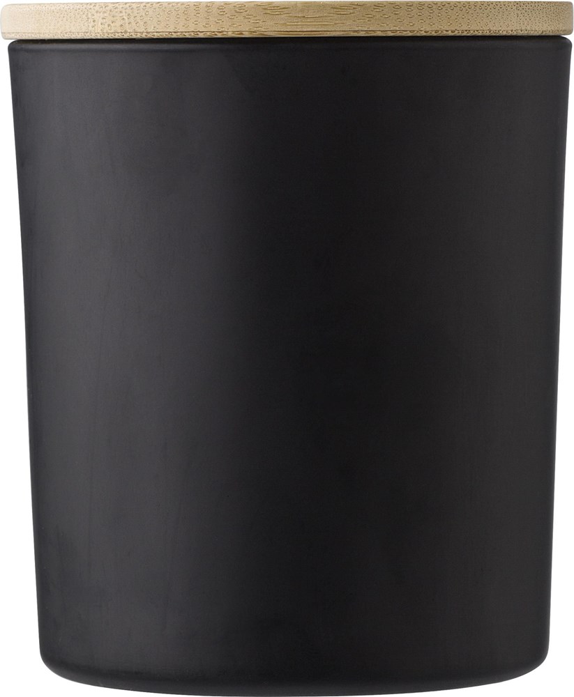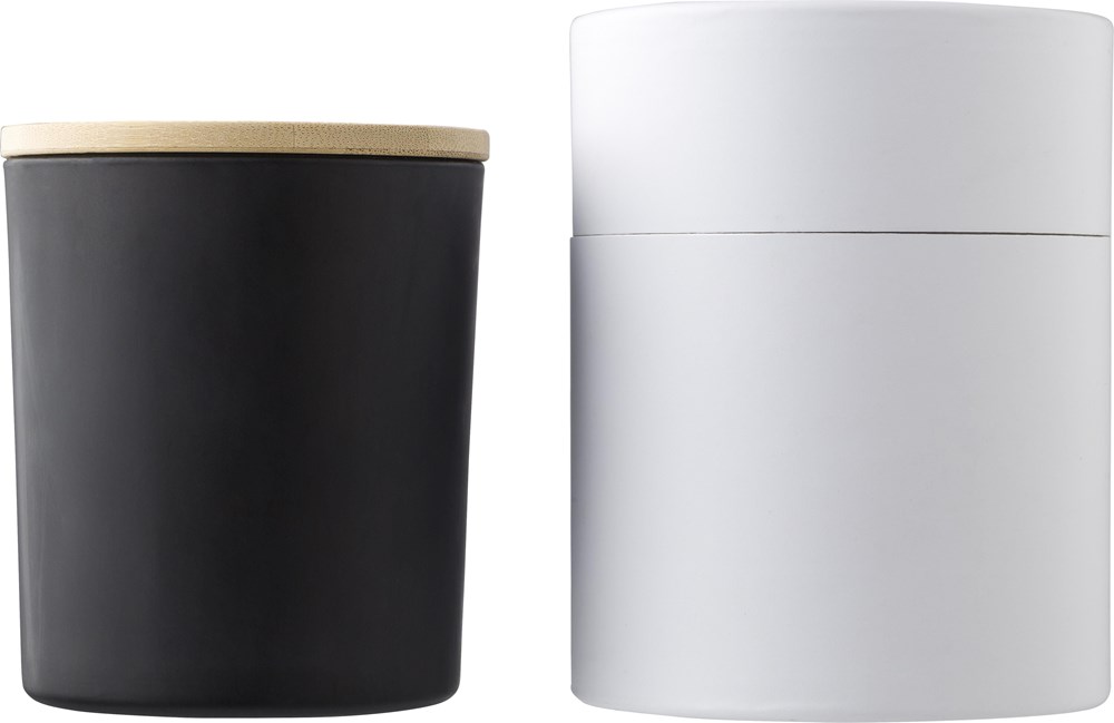 Bougie à base de cire de Carnauba dans un contenant en verre et un couvercle en bambou, d'une durée de 20H, livrée dans un tube cadeau blanc. 4 senteurs sont proposées selon le coloris du contenant : cannelle (bordeaux), vanille (blanc), bois de santal (noir) et jasmin (vert). Gravure laser non conseillée pour le coloris blanc.