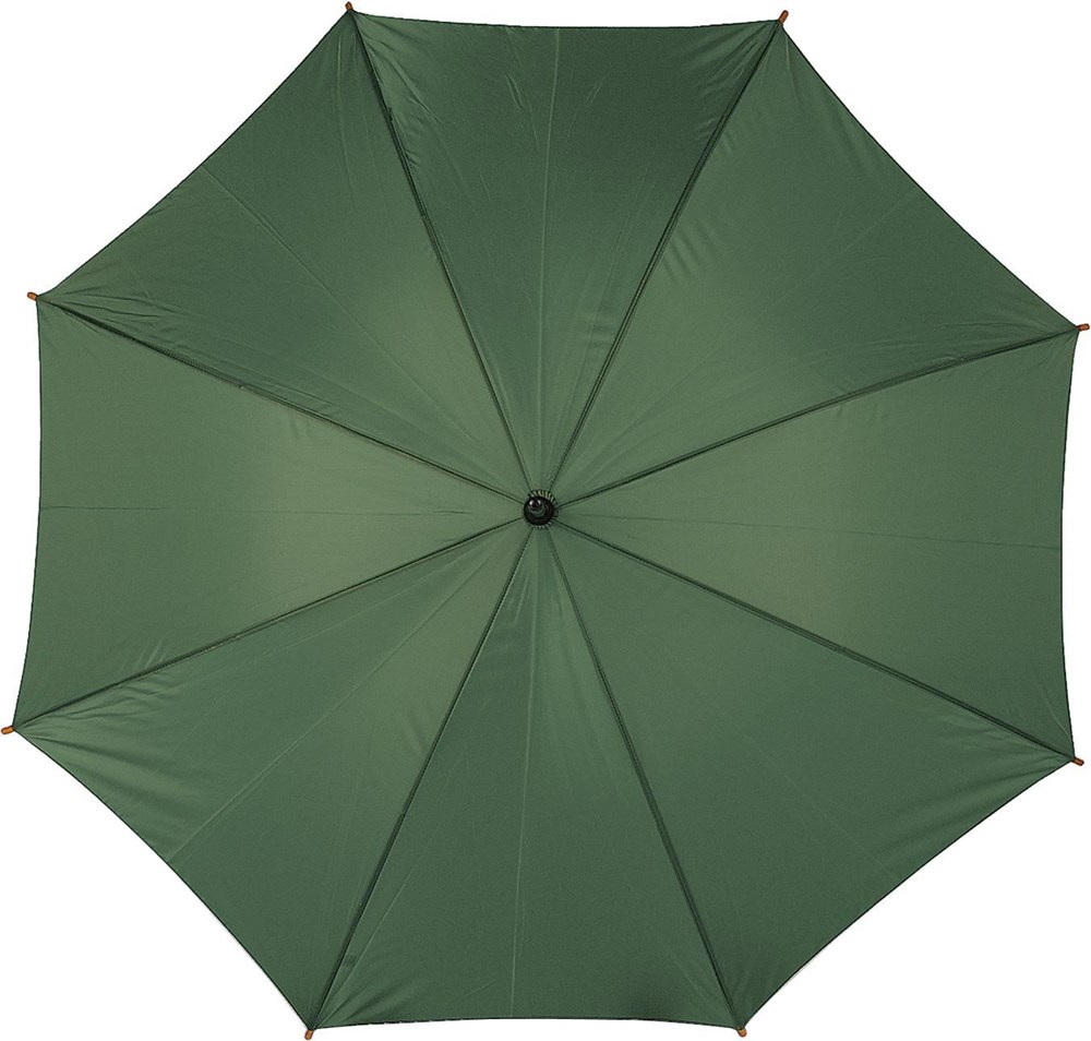 Parapluie golf automatique en polyester 190T, baleines en métal, mât et manche canne en bois.