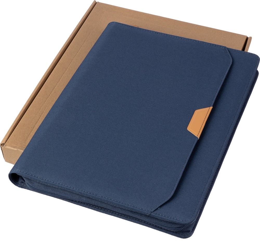 Conférencier A4 zippé en rPET et PU muni de plusieurs compartiments, livré avec bloc-notes de 20 feuilles lignées dans une boîte cadeau kraft.