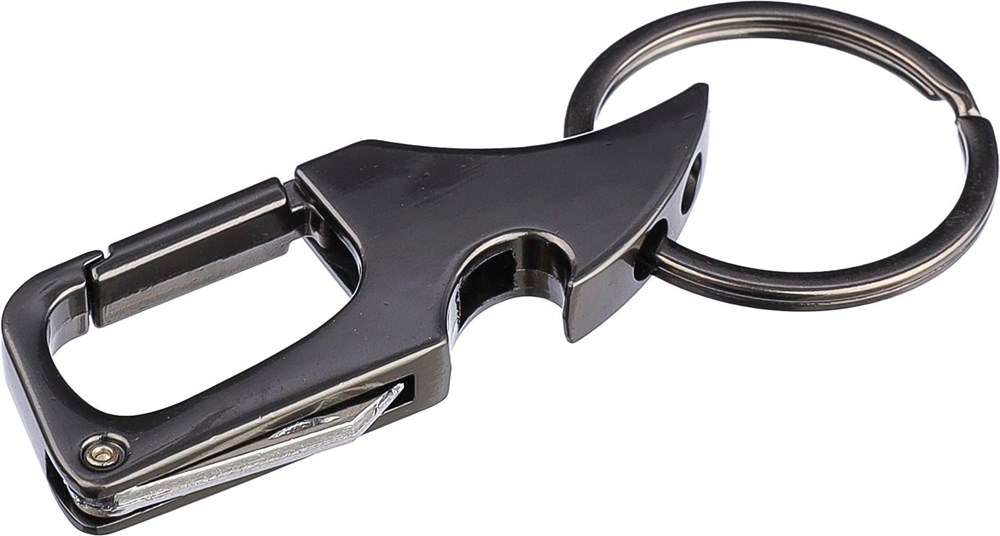 Porte-clés mousqueton en métal comprenant un décapsuleur et un canif dans une pochette en kraft.