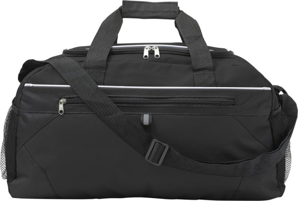 Sac de sport en polyester 600D avec poche frontale zippée et poches latérales filet.
