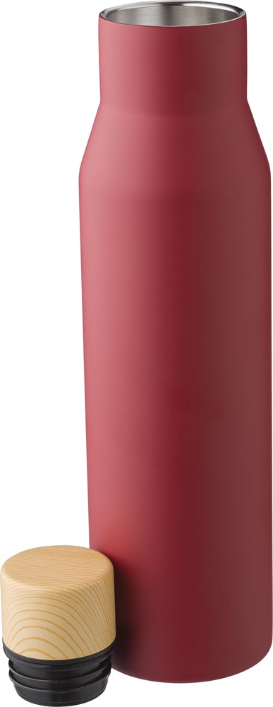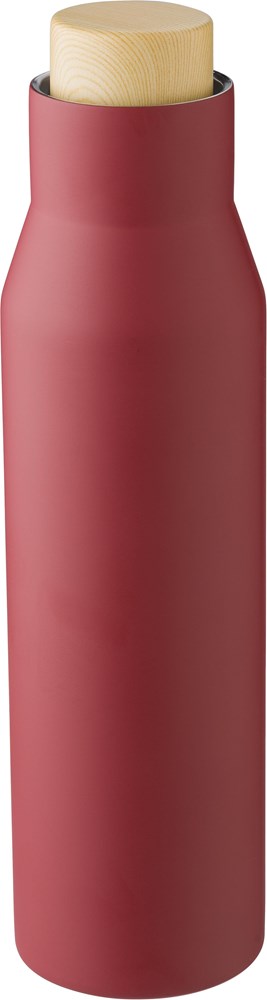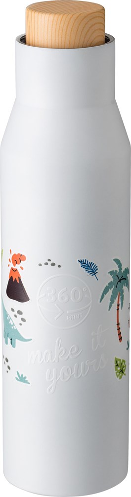 Gourde isotherme double paroi en acier inoxydable 304 mat d'une contenance de 500 ml munie d'un bouchon en plastique rendu bois dans une boîte en kraft.
