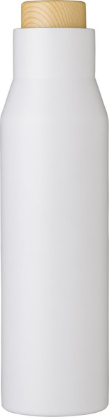 Gourde isotherme double paroi en acier inoxydable 304 mat d'une contenance de 500 ml munie d'un bouchon en plastique rendu bois dans une boîte en kraft.