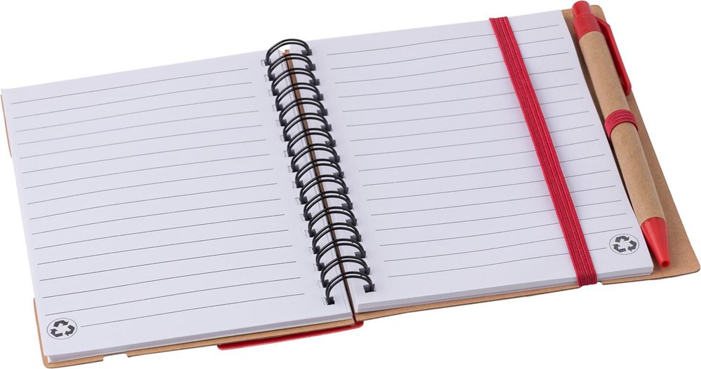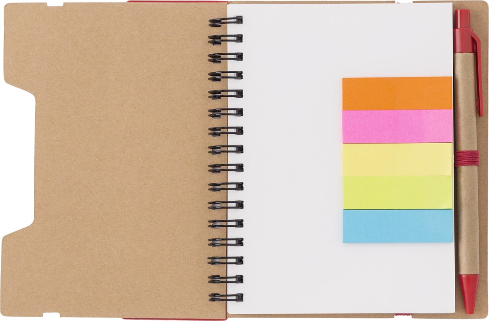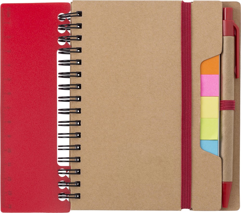 Carnet à spirale en papier recyclé avec fermeture élastique contenant 60 feuilles lignées, 25 marque pages repositionnables par coloris, une règle et un stylo bille, mine noir.