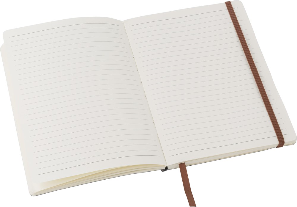 Carnet A5 avec couverture souple en PU contenant 80 feuilles lignées, une pochette intérieure, fermeture élastique et marque-page.