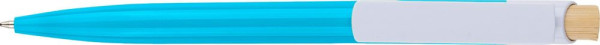 Stylo-bille en ABS recyclé avec bouton-poussoir en bambou et clip blanc. Logo recyclé intégré au moule. Longueur d'écriture approximative de 600 mètres. Encre bleue.