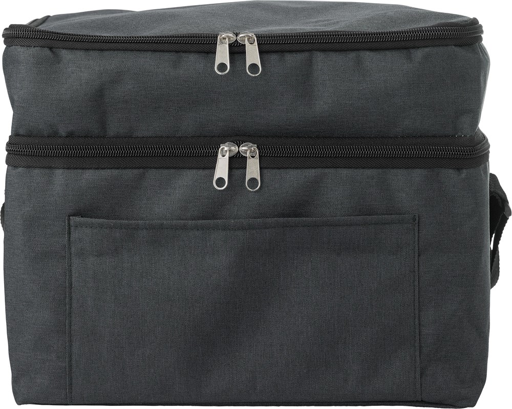 Sac isotherme en polyester rPET avec poche frontale et double compartiments zippés.