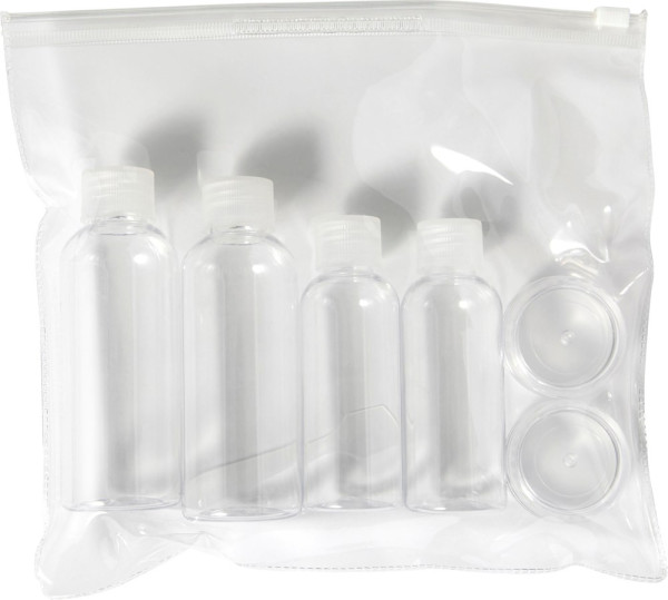 Kit de voyage comprenant 2 flacons de 100 ml, 2 de 50 ml, 2 de 10 ml et 1 spatule dans une pochette zippée transparente