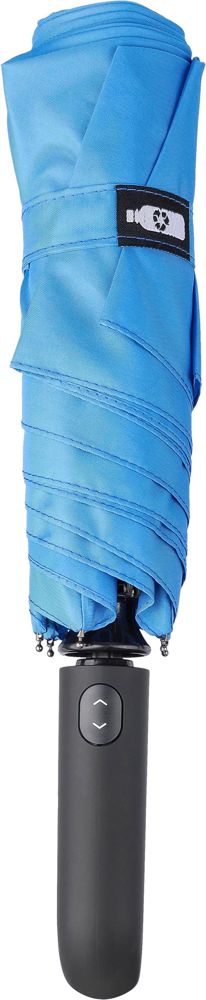 Parapluie tempête pliable en rPET 190T avec ouverture et fermeture automatiques, armature en métal, manche avec mousqueton en plastique, livré avec une housse.