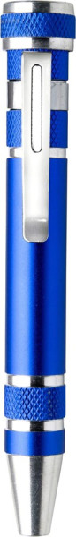 Tournevis en aluminium avec 4 embouts plats et 4 cruciformes.