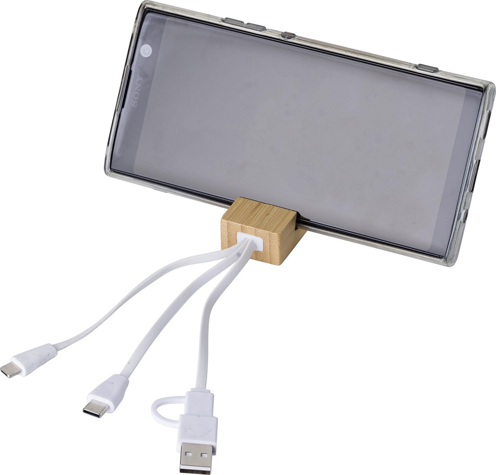 Porte-clés en bambou avec support de téléphone et câbles de charge avec connectiques d'entrée USB/USB-C et sortie USB-C et Lightning.