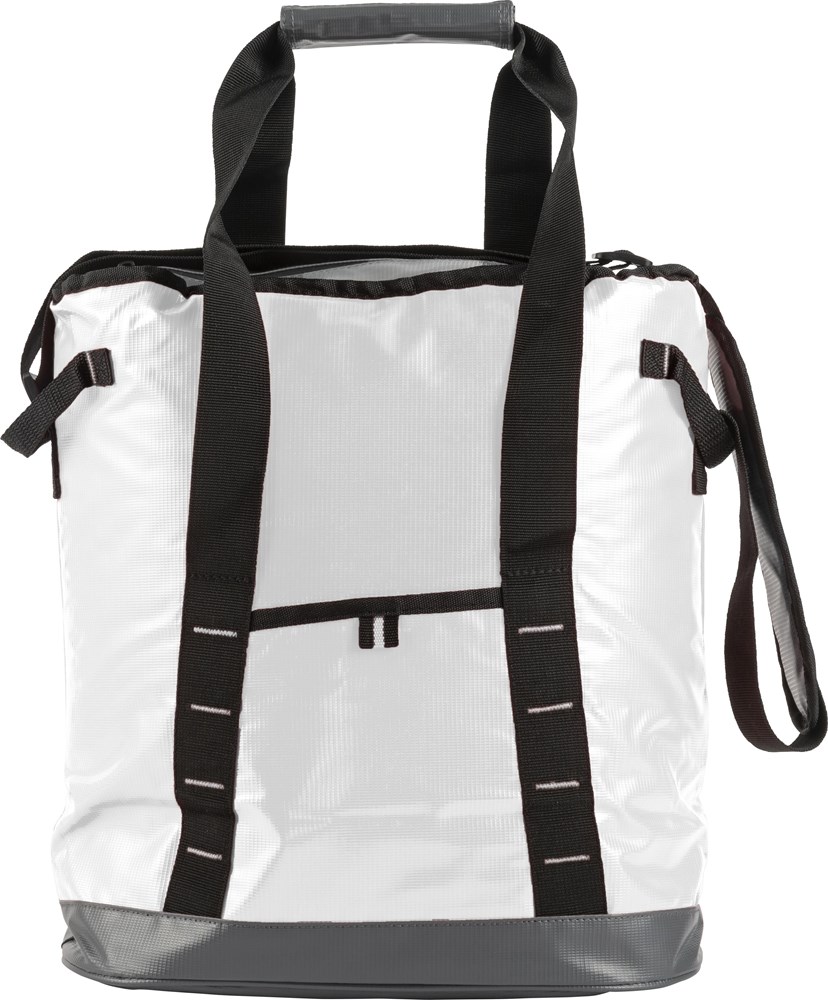 Sac isotherme zippé en PVC avec bandoulière ajustable.