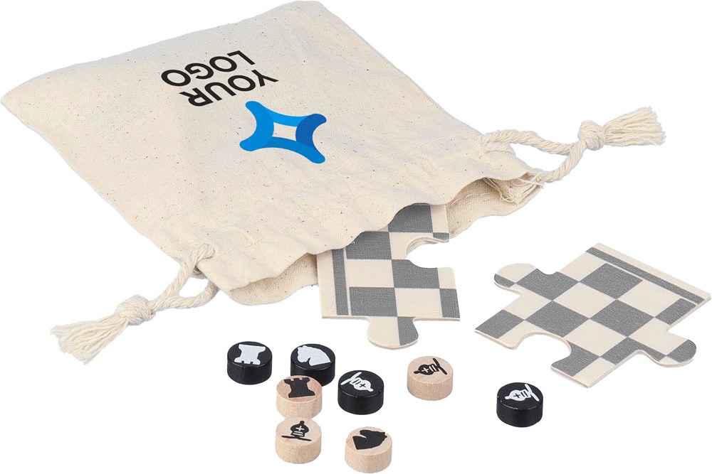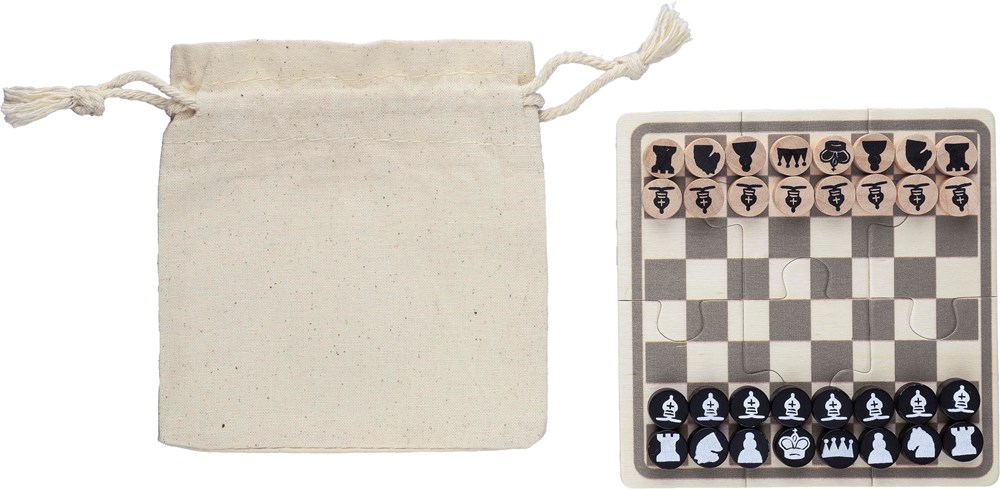 Jeu d'échecs et de dames en bois dans une pochette en coton avec fermeture par cordelette comprenant un puzzle imprimé de 6 planches et 16 pions en bois imprimés.