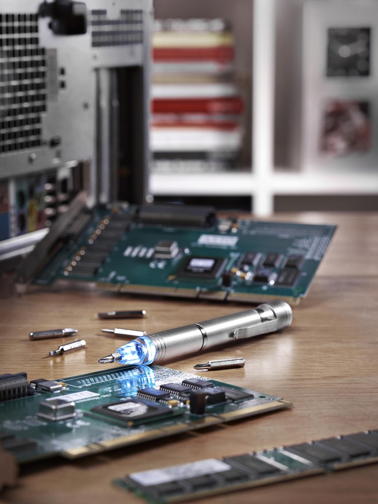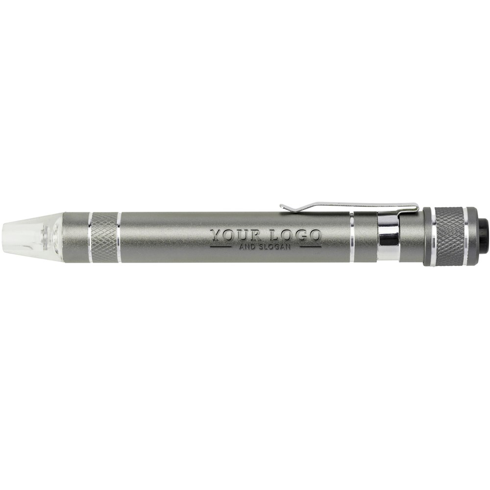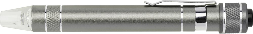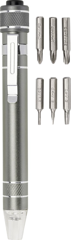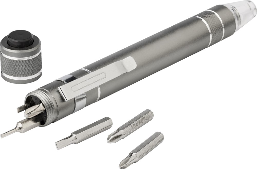 Tournevis en métal et aluminium avec 3 embouts plats et 3 embouts cruciformes muni d'une LED.