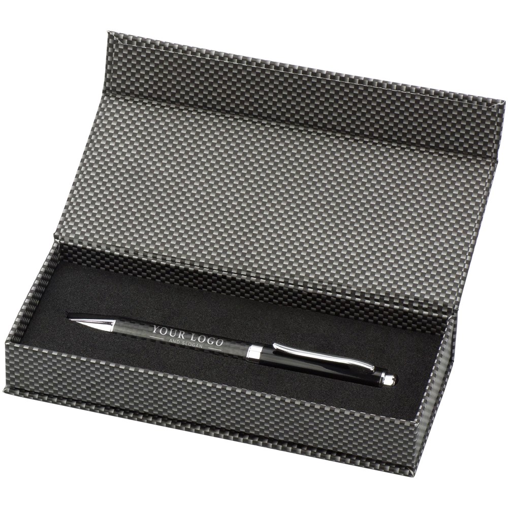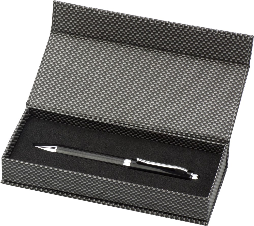 Stylo bille twist en carbone et métal dans un écrin à fermeture magnétique, mine noire.