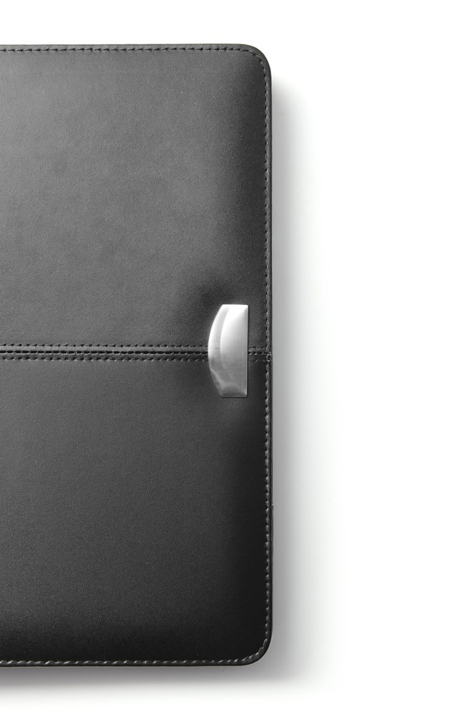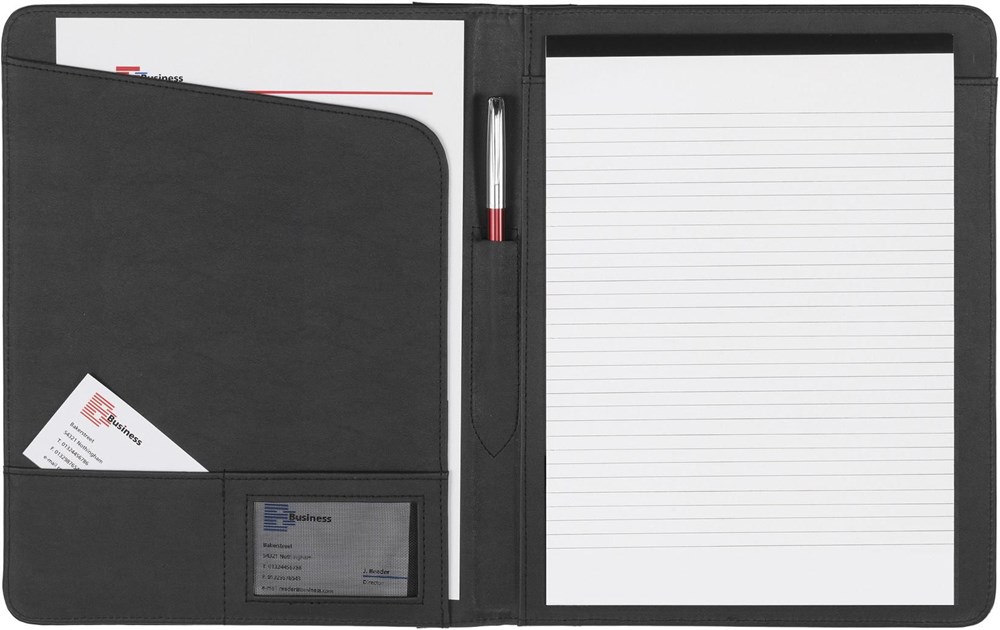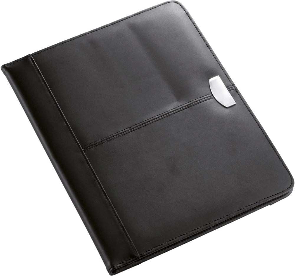 Conférencier A4 en cuir reconstitué (synderme) muni d'une plaque métallique, livré avec bloc-notes, sans stylo.