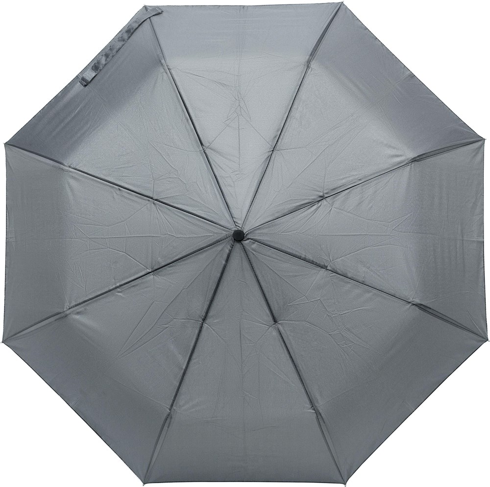 Parapluie pliable en polyester pongée 180T avec ouverture et fermeture automatiques, mât en métal et baleines en fibre de verre, manche en plastique, livré avec une housse.