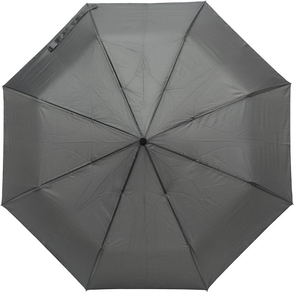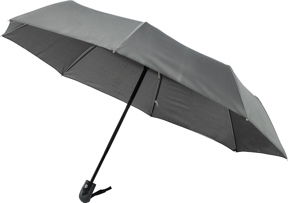 Parapluie pliable en polyester pongée 180T avec ouverture et fermeture automatiques, mât en métal et baleines en fibre de verre, manche en plastique, livré avec une housse.