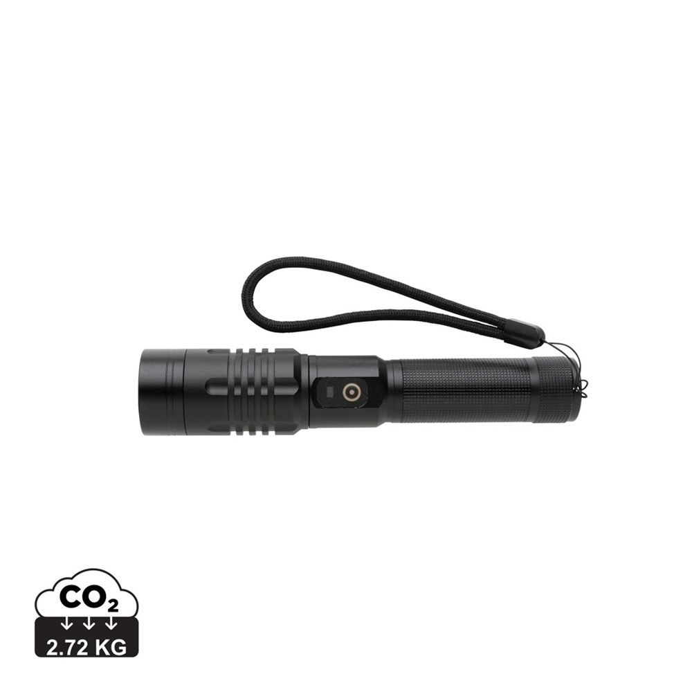 Lampe de poche rechargeable avec le corps en alliage d'aluminium de qualité et une batterie 2000 mAh pour une utilisation jusqu'à 4 heures sur une seule charge (via USB). Grâce à son indice IPX4, elle est résistante aux intempéries et peut donc facilement être utilisée à l'extérieur. L'ampoule puissante crée jusqu'à 1000 lumens et un faisceau qui atteint jusqu'à 500 mètres. L'ampoule de haute qualité est dotée de 5 modes, dont la fonction SOS.