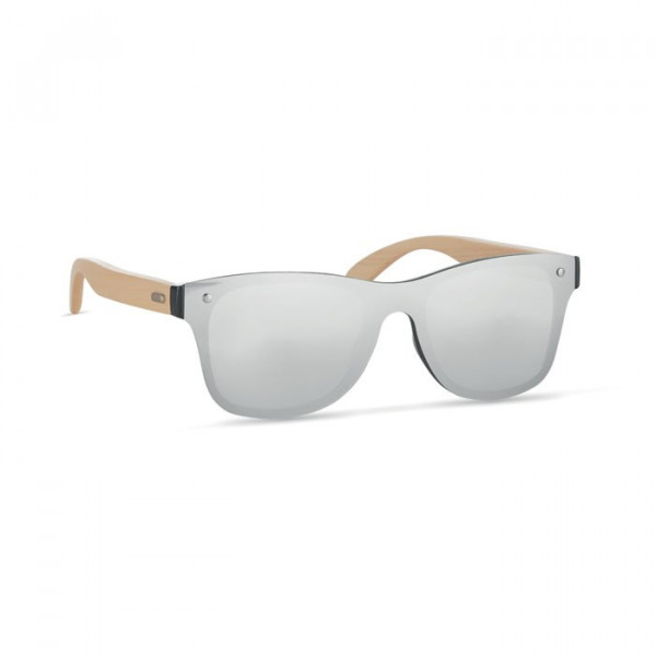 Lunettes de soleil avec branches en bambou et verre miroir. Protection UV400. Le bambou étant un matériau naturel, la couleur varie d’un article à l’autre.