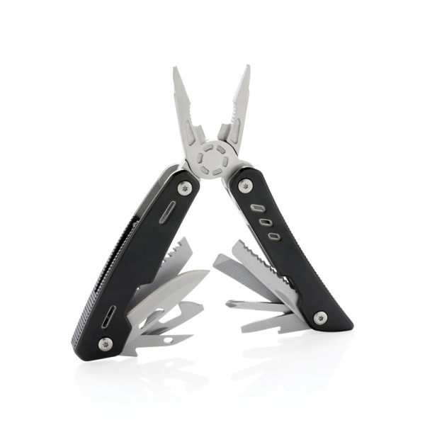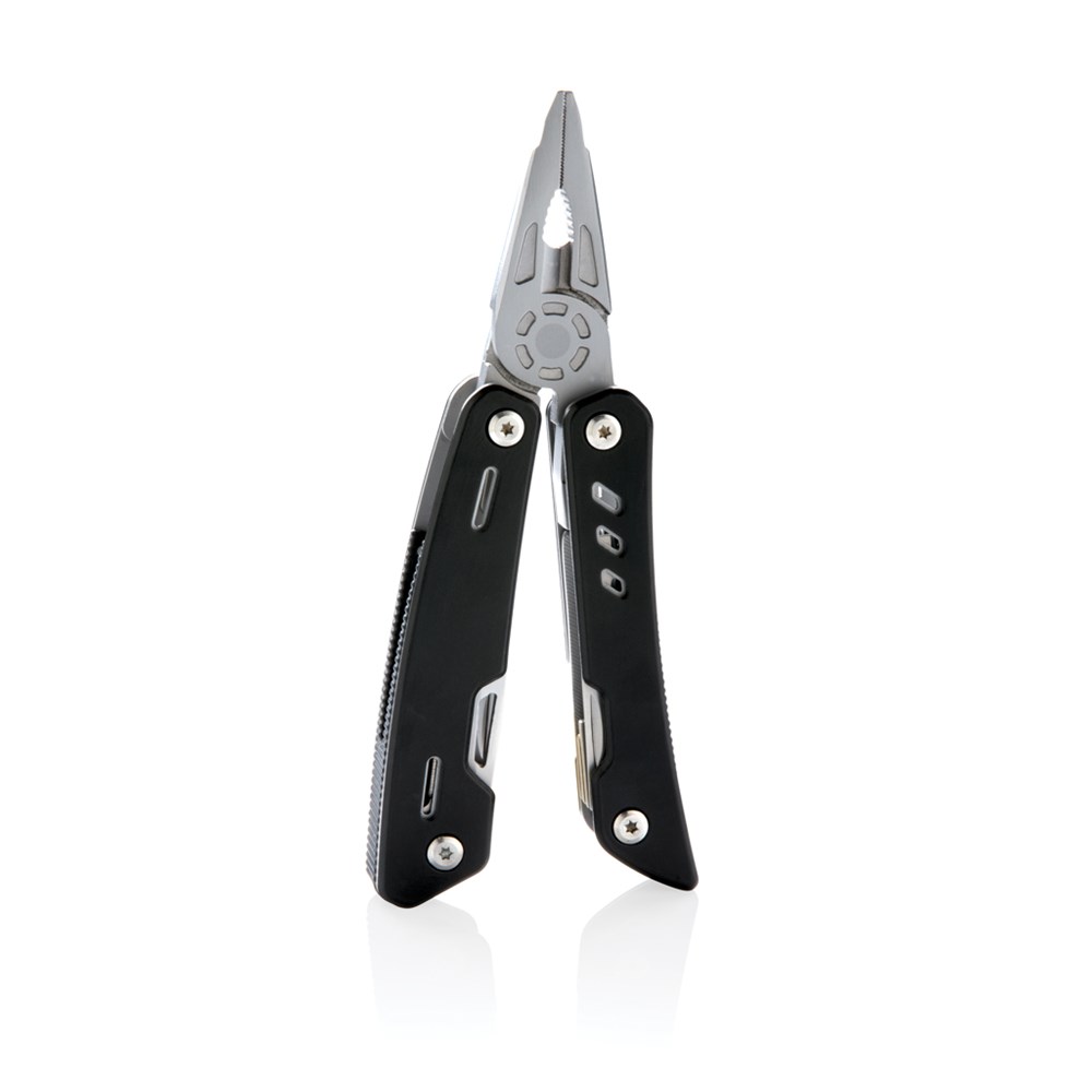 Outil multifonctions robuste en aluminium avec 12 fonctions. Les outils en acier inoxydable sont: pince à bec, pince, pince coupante, couteau, tournevis cruciforme, petit tournevis plat, scie, ouvre-boite, décapsuleur, lame dentelée, poinçon et lime. E