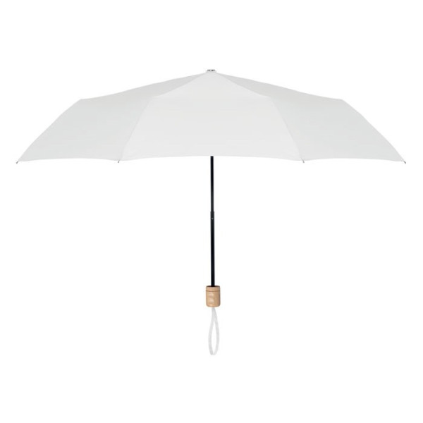 Parapluie pliable de 21'', attributs en pongé 190T RPET,mât et baleines en métal plaqué noir et manche en bois. Ouverture et fermeture manuelles. Pochette individuelle.