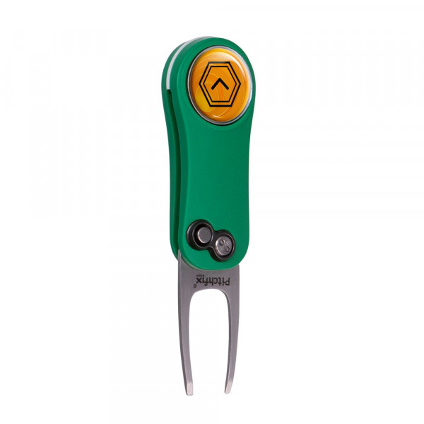 Lichtgewicht inklapbare pitchfork gemaakt van hoogwaardig ABS kunststof, voorzien van een magnetische ball marker met doming