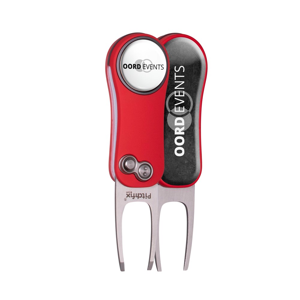 Lichtgewicht inklapbare pitchfork gemaakt van aluminium met een ABS rubberen handgreep, voorzien van een magnetische ball marker met doming en een grote doming op de achterzijde