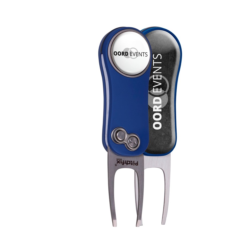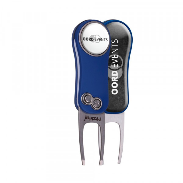 Lichtgewicht inklapbare pitchfork gemaakt van aluminium met een ABS rubberen handgreep, voorzien van een magnetische ball marker met doming en een grote doming op de achterzijde