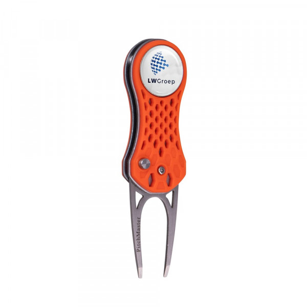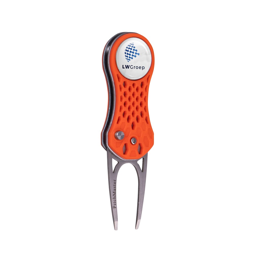 Lichtgewicht inklapbare aluminium pitchfork met een kunststof behuizing, voorzien van een magnetische ball marker met doming