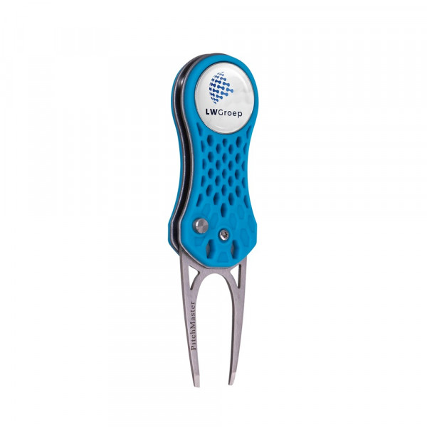 Lichtgewicht inklapbare aluminium pitchfork met een kunststof behuizing, voorzien van een magnetische ball marker met doming