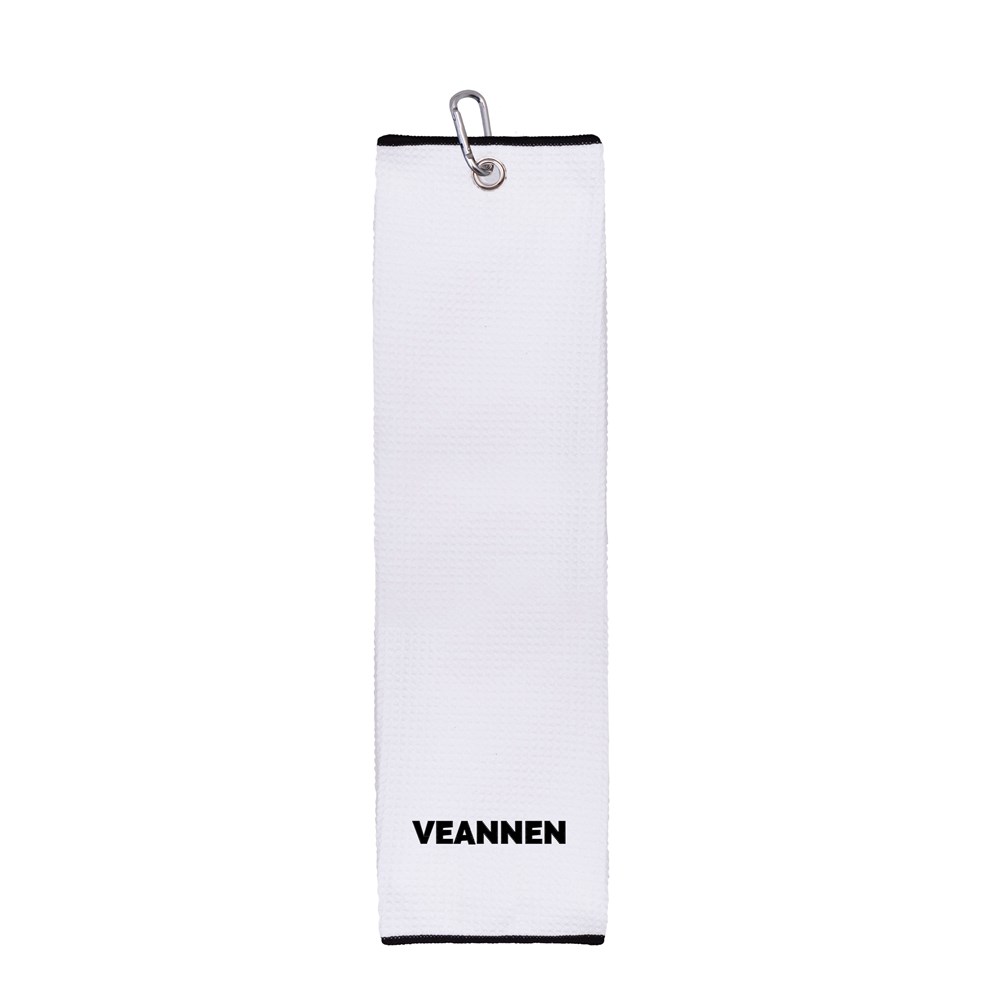 Microfiber golfhanddoek in drieën gevouwen met karabijnhaak, formaat 13 x 50 cmplus