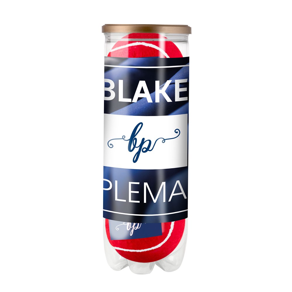 3 gekleurde bedrukte drukloze tennisballen verpakt in een transparante koker met etiket rondom....plus