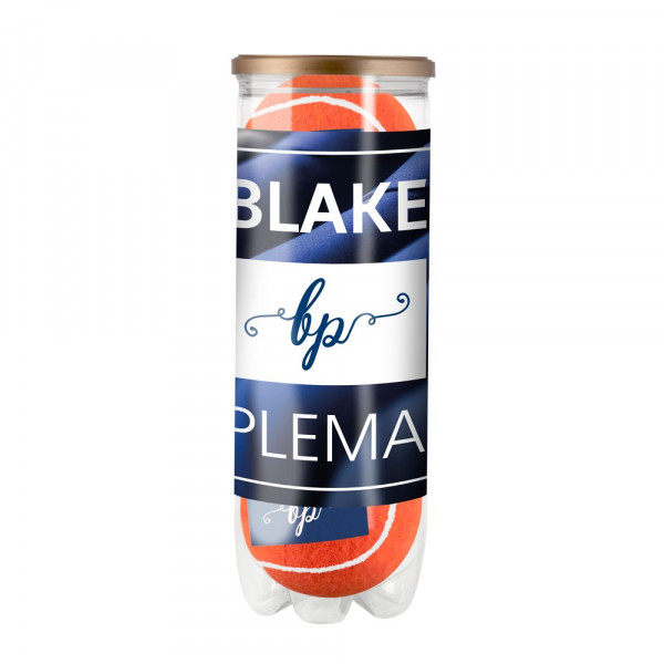 3 gekleurde bedrukte drukloze tennisballen verpakt in een transparante koker met etiket rondom....plus