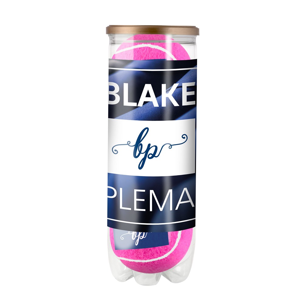 3 gekleurde bedrukte drukloze tennisballen verpakt in een transparante koker met etiket rondom....plus