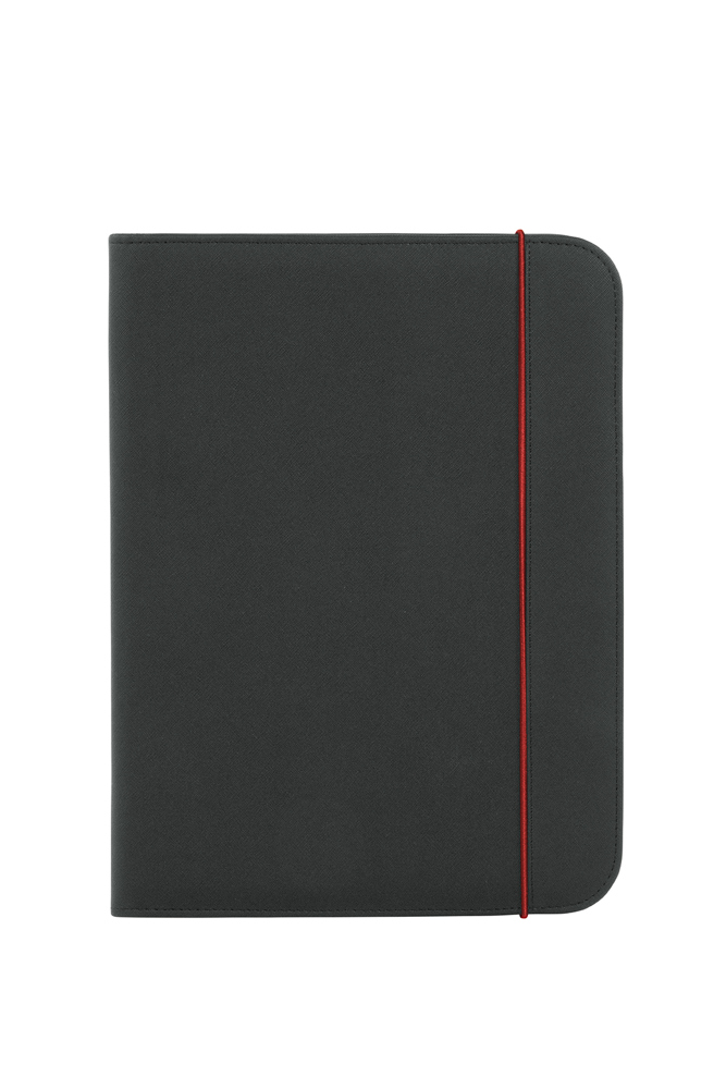 schrijfmap met organizer-elementen; afsluitbaar met decoratieve rubberband; incl. schrijfblok; vlak insteekvak; rubberen lus voor balpen