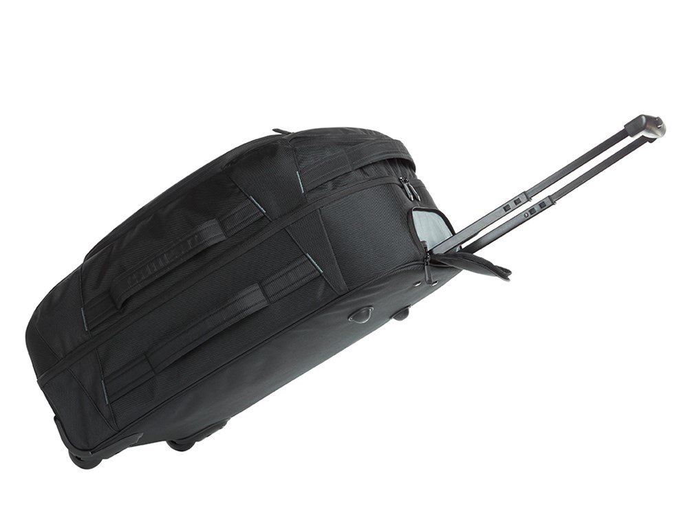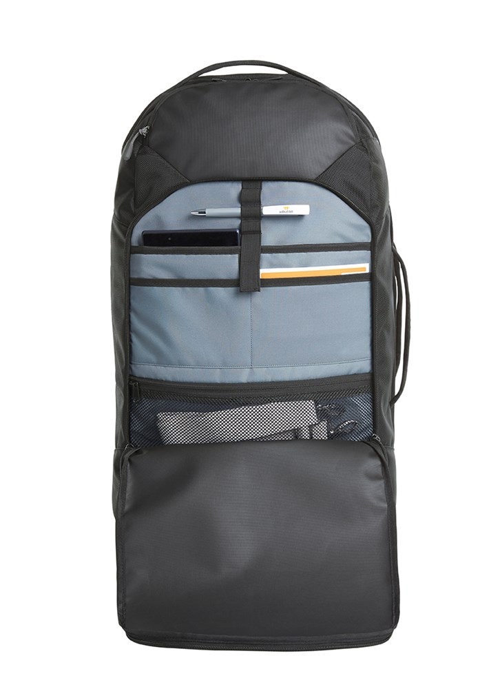 luxueus afgewerkte rolreistas met reflexbeleg; hoofdvak met drievoudige meerwegsluiting; hoofdvakbovenkant met scheidingswand met ritssluiting; hoofdvakonderkant met elastische pakriemen; kleine voortassen met kleurige ritssluitingschuiver; groot voorvak met 2-wegritssluiting; verstevigd, plat insteekvak; twee kleine insteekvakken; groot netvak met ritssluiting en elastische lus; verstevigde draaggrepen; versterkte bodem; met noppen aan de bodem; telescoopgreep; lichte looprollen
