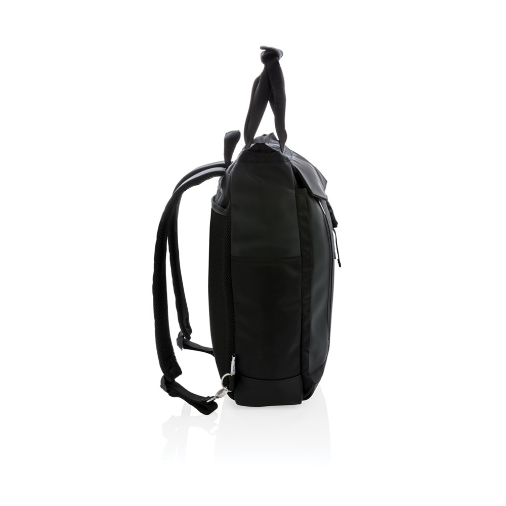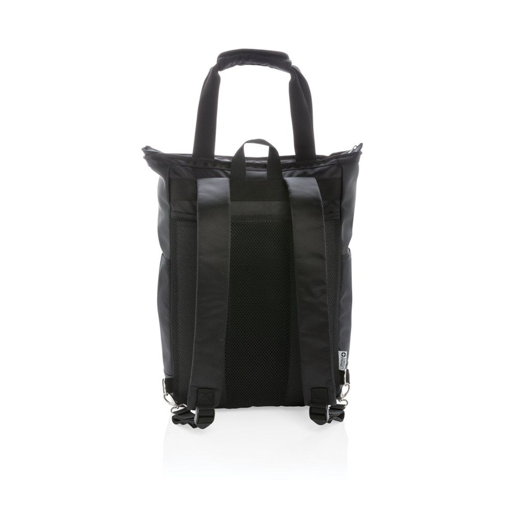 Sac à dos polyvalent 300D qui peut être porté à l'épaule, à la main ou comme sac à dos, avec un compartiment rembourré pour ordinateur portable de 15.6' et des poches avec protection anti-RFID. Sans PVC.
