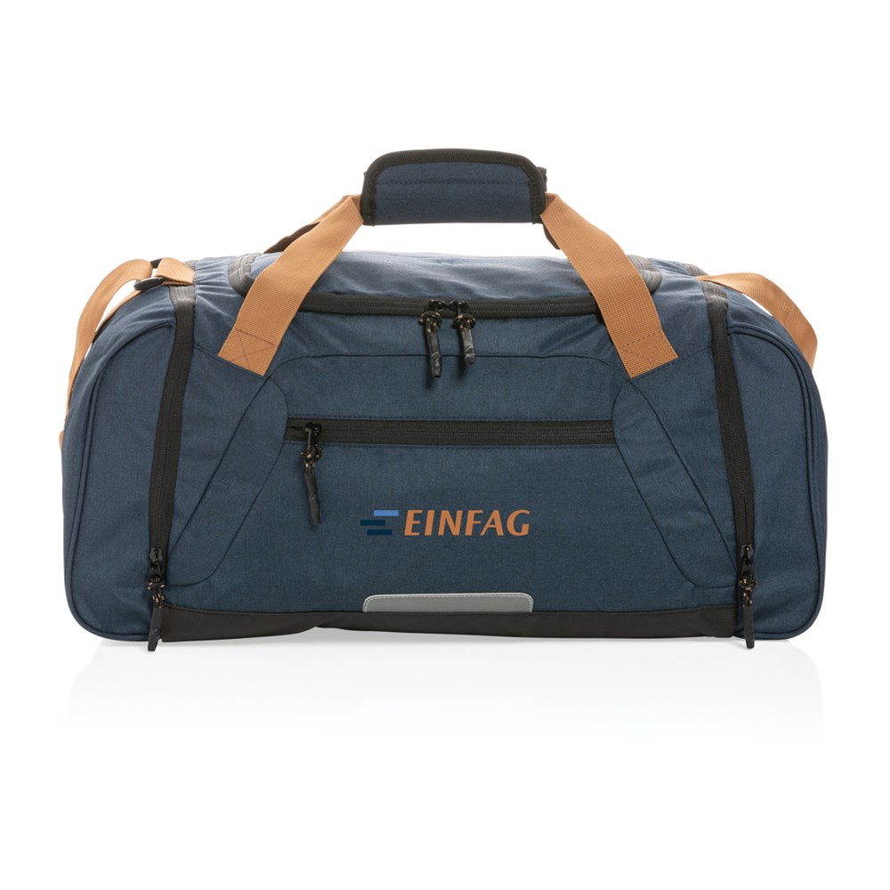 Sac weekend deux tons 50% polyester recyclé et 100% polyester recyclé pour la doublure. Compartiment à fermeture à zip et un grand compartiment principal. Les poches zippés latérales vous permettent d'accéder rapidement aux objets essentiels. Avec traceur AWARE™ qui prouve l'utilisation réelles des matériaux recyclés. Chaque sac a réutilisé 24,05 bouteilles en PET 0,5L. 2% de chaque produit IMPACT vendu sera reversé à Water.org.