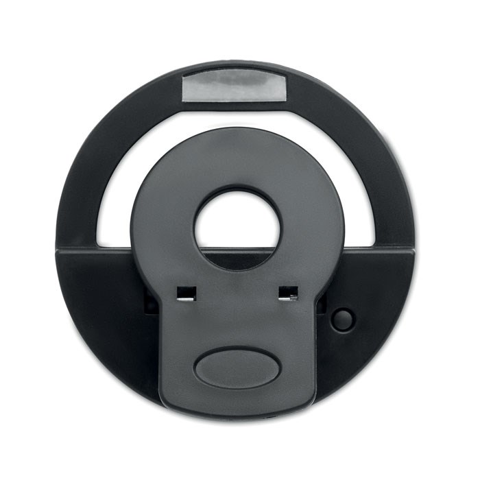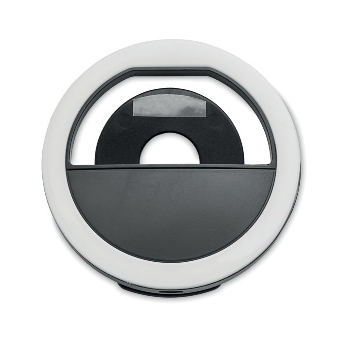 Lampe circulaire 8cm portable pour selfie en ABS avec 28 LED. Lumière blanche réglable sur 3 niveaux de luminosité différents. Batterie USB rechargeable de 80 mAh.