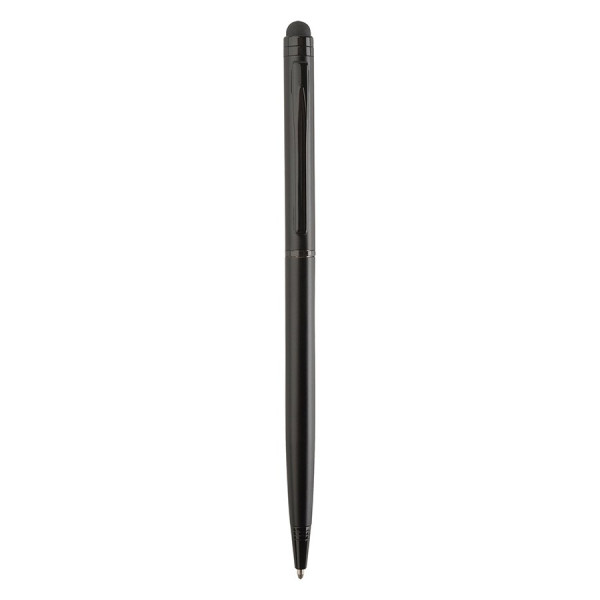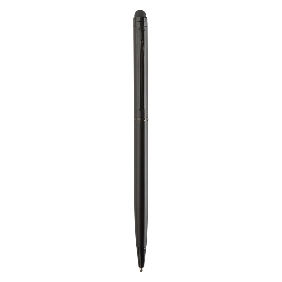 Multifunctionele balpen met slank profiel met bovenop een stylus voor apparaten met touchscreen, in matte afwerking met glanzende versiering.