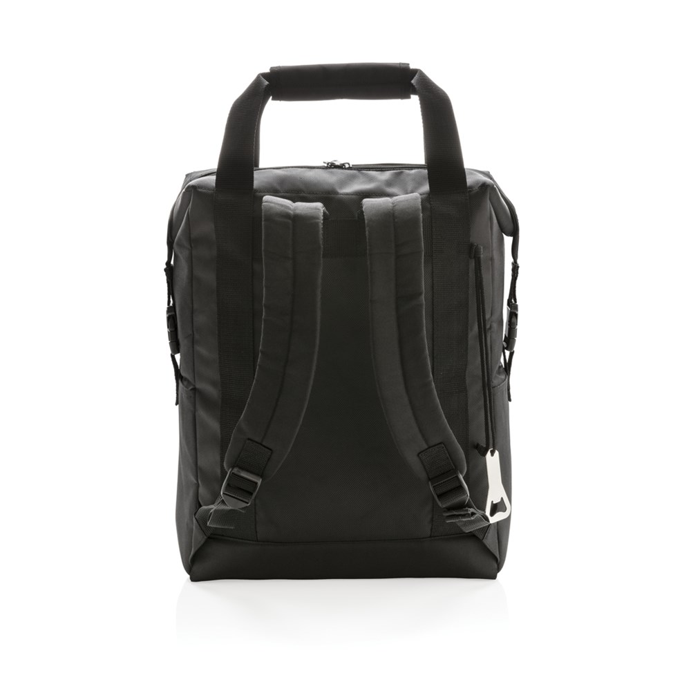 Luxe 1680D en 600D polyester koeldraagtas/rugzak met extra groot hoofdvak met rits en voorvak met rits. Grote opslagruimte; er passen ongeveer 28 blikjes in. Dubbel versterkte handgrepen. Inclusief flesopener. PEVA-isolatie.